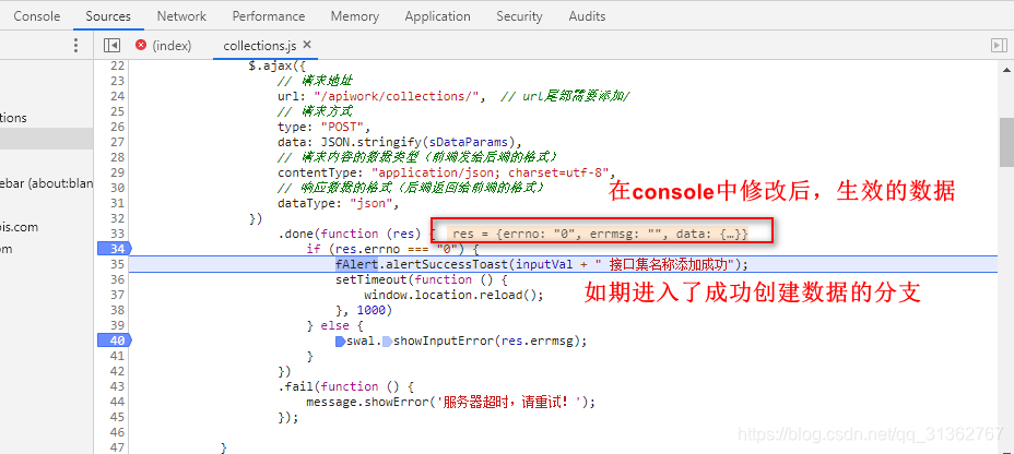 发现 bug 根源在于后端传给前端的数据中 errno 的值不是 “0” 的问题,如果直接下一步可以肯定进入 else 语句,于是在上一步中在 console 中修改正确的数据后,再回到 Sources 中执行下一步。